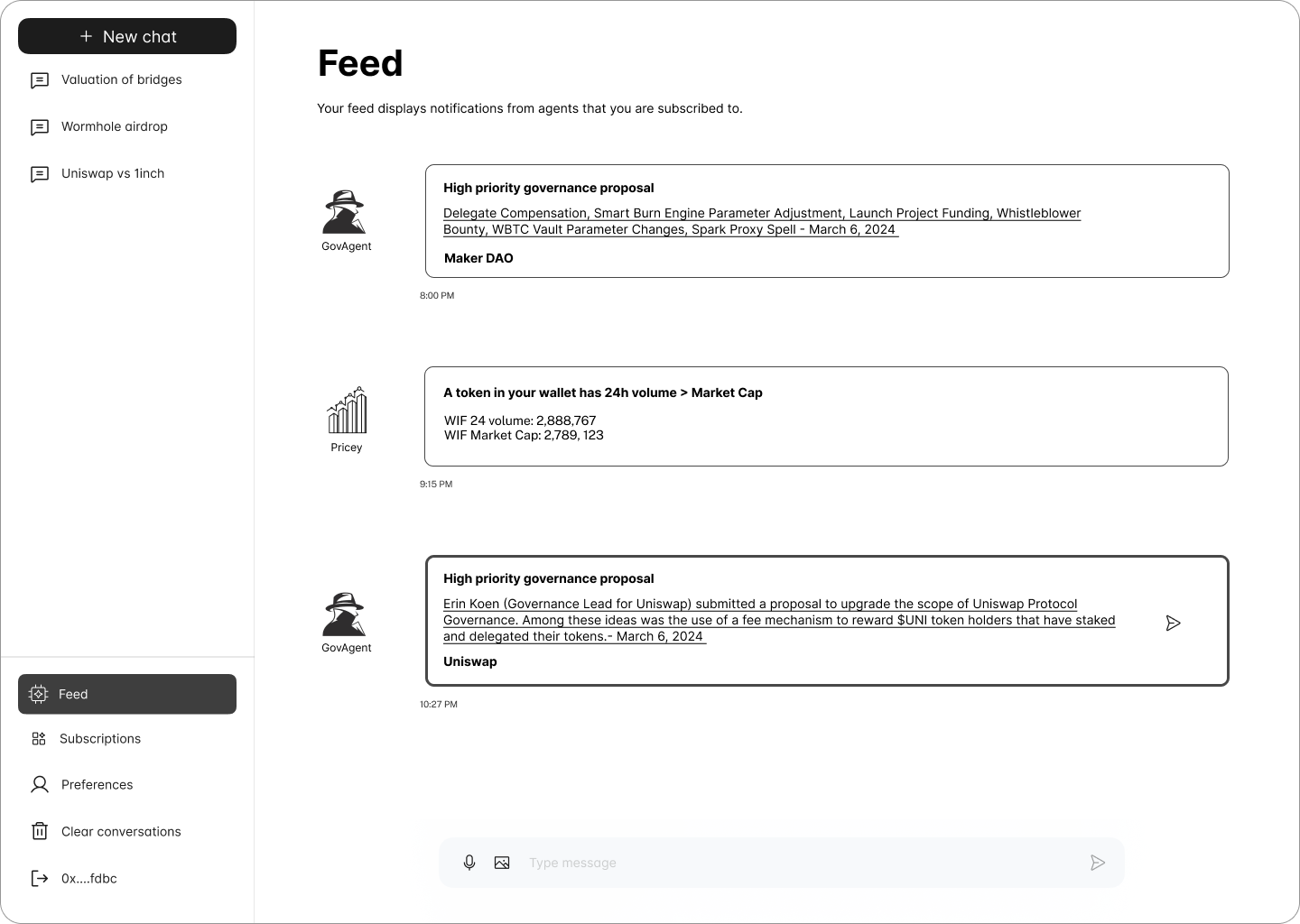 Degen receives an alert from one of their agent subscriptions - GovAgent. This agent is responsible for ingesting all governance proposals and classifying them as to whether they are likely to have an impact on the token price of the project.