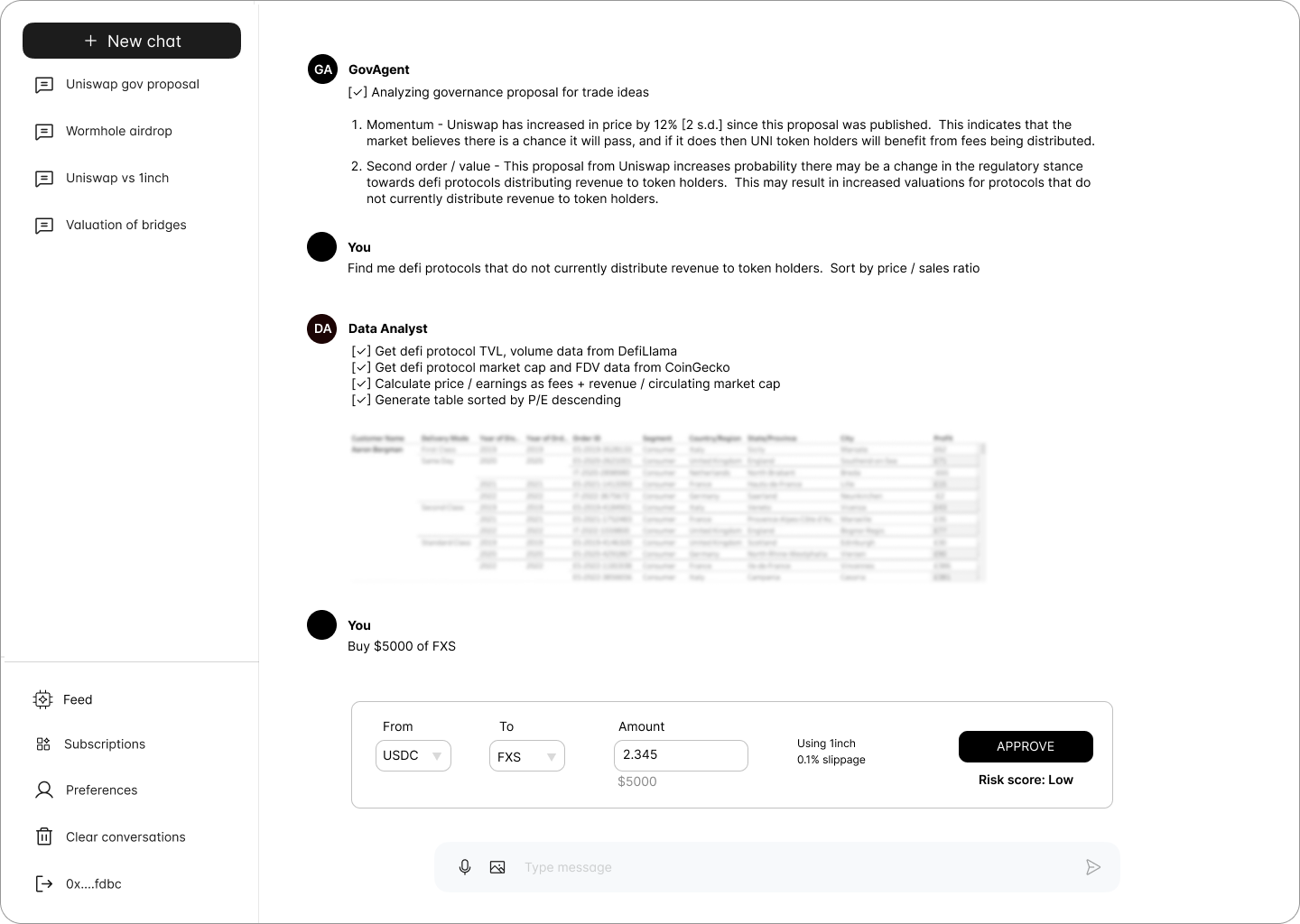 The user sees the alert and clicks on it to start a new chat, inviting GovAgent to participate. GovAgent provides further analysis of the governance proposal, and suggests possible impacts, such as a rerating of revenue-generating DeFi protocols that do not currently distribute revenue to their users. The user decides to pursue this and requests an analysis of undervalued DeFi tokens, which our local agent delegates to the Data Analysis tool.